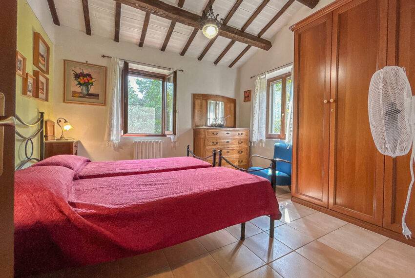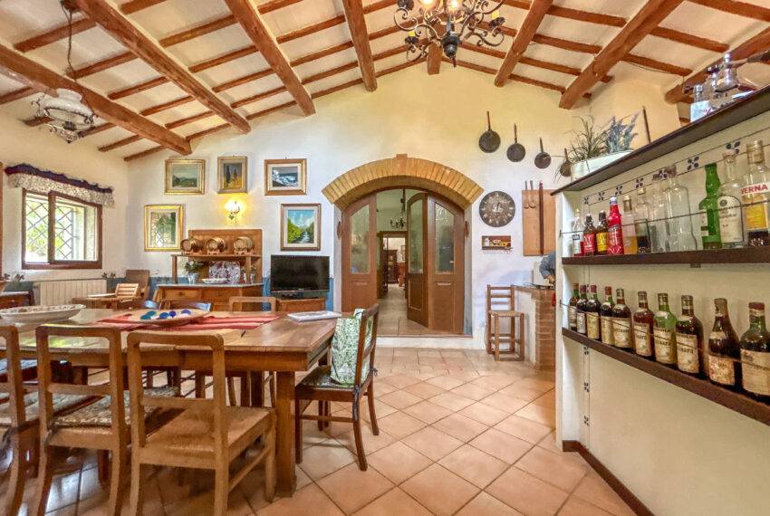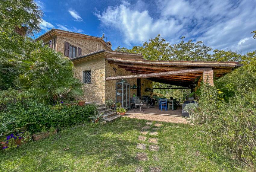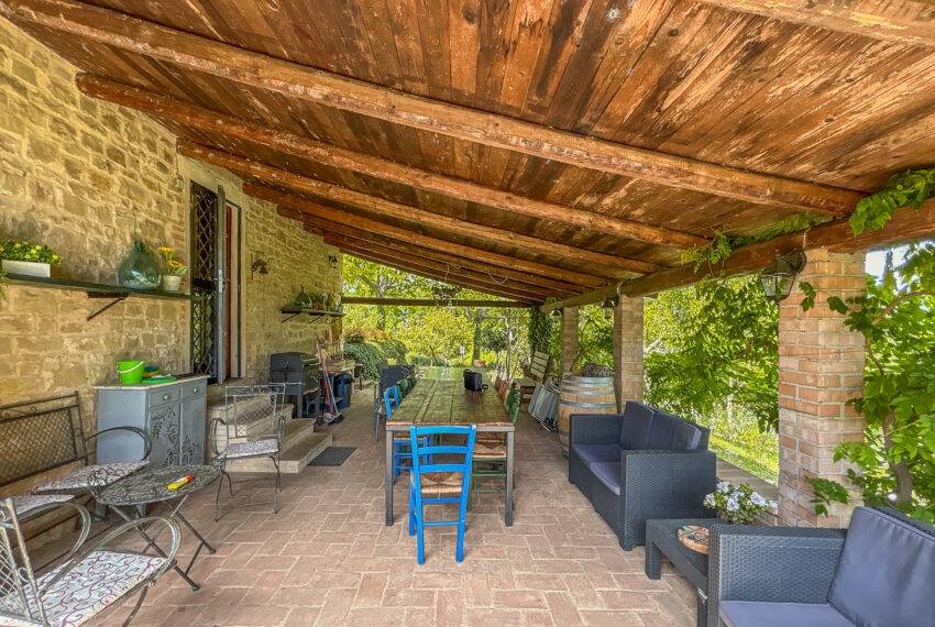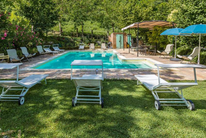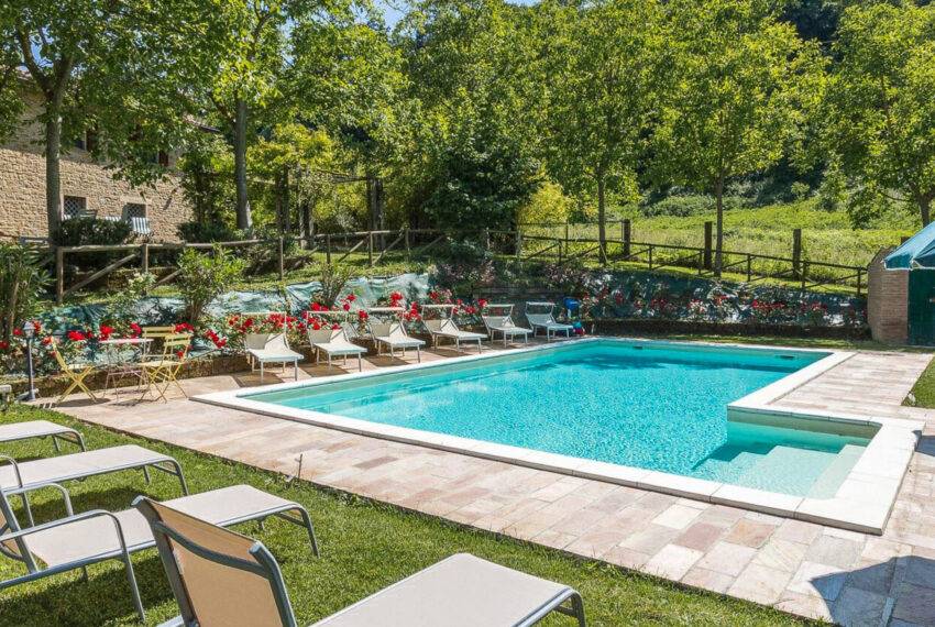 Casale Sant’Elena is a marvellous farmhouse nestled in the fields and woods of Serra San Quirico and a stone's throw from Angeli di Rosora village. The property was completely rebuilt in 1995 and is located in a true corner of paradise, concealed from the road, and surrounded by hills and lush woods. To top it up, a short path through the woods leads to the local farm producing organic olive oil and wine. Many fruit trees, herbs and flowers live in the 2,500 sqm garden. A private well provides water for automatic irrigation during the summer months. The large house porch looks onto a stylish swimming pool with Roman steps.